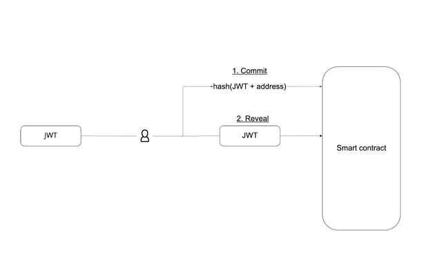 Enforcing Ownership. You may have noticed a flaw in this logic — somebody can frontrun the commitment (the hashing) in addition to the reveal. I.e., they can copy the hash in the first block and then copy the reveal in the later block. So it seems as if they knew the JWT in the first place, because they knew its hashed value. To fix this, instead of just commiting hash(JWT), you can commit hash(JWT + your address). If an attacker copies this commitment, they don’t gain anything. After you or they reveal the JWT, the smart contract can see it was linked to your address, not theirs.
